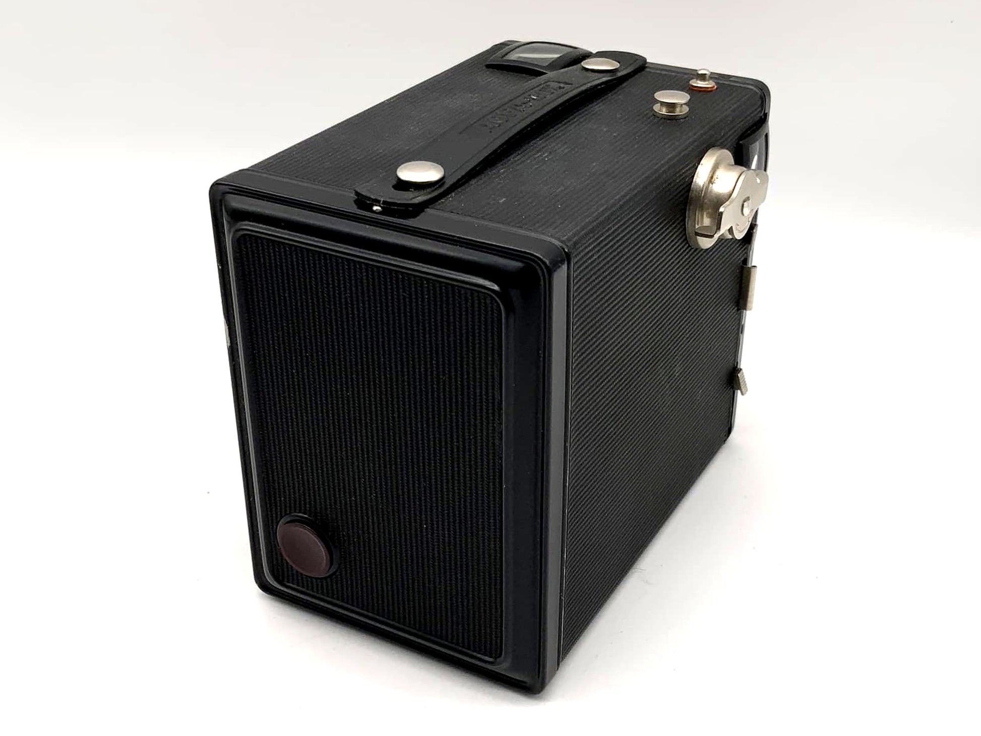 This classic box camera has been carefully inspected by us and is in perfect working order. The mechanical shutter works reliably. The body shows only slight signs of age-related wear.