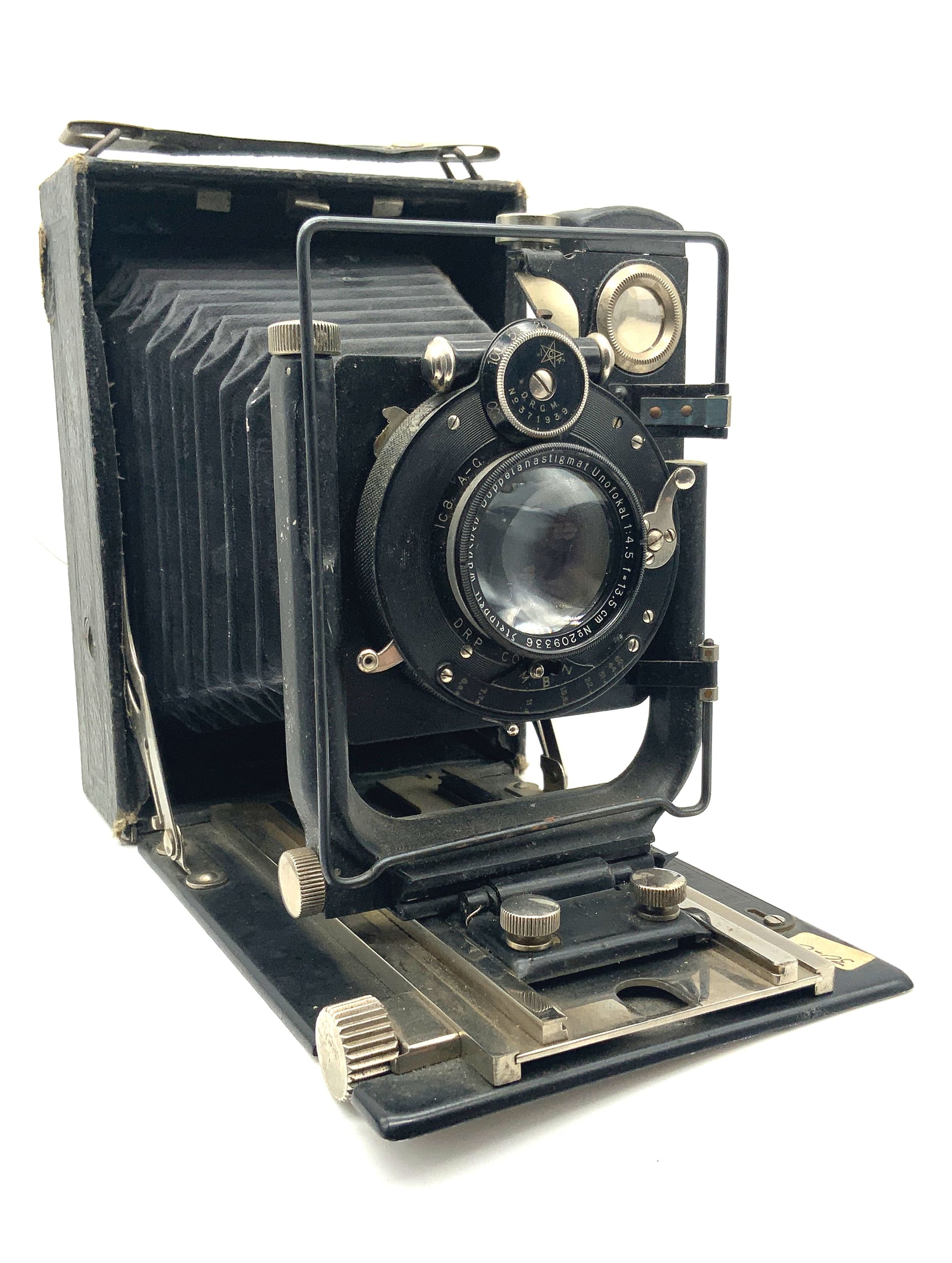 Diese klassische Plattenkamera ist ein echtes Stück Fotografiegeschichte. Sie wurde sorgfältig geprüft und ist technisch funktionsfähig: Der Verschluss arbeitet, der Balgen ist lichtdicht und der Auszug lässt sich nutzen.